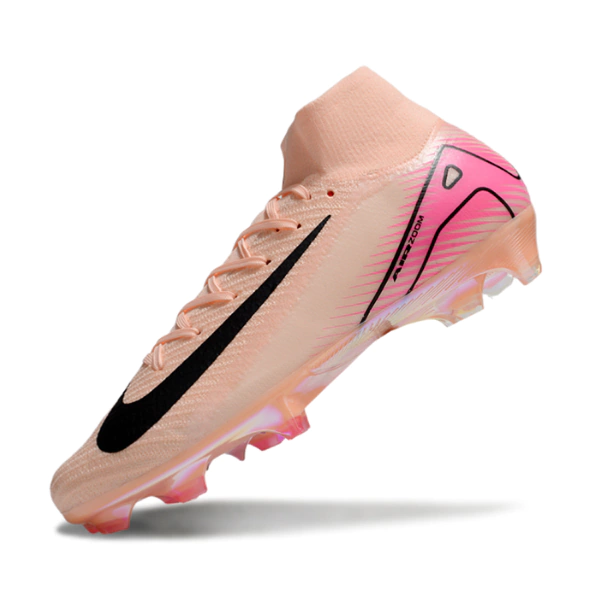 Los botines Nike Air Zoom Mercurial Superfly 10 Elite FG en color rosa representan una fusión perfecta entre tecnología avanzada y diseño estilizado, ideales para futbolistas que buscan maximizar su rendimiento en el campo. Este modelo destaca por su construcción de tejido Flyknit, que proporciona una sujeción excepcional y una sensación de segundo piel, permitiendo una mayor agilidad y comodidad durante el juego. Además, la tecnología Zoom Air en la suela ofrece una amortiguación reactiva, lo que se traduce en una respuesta rápida y eficiente al realizar movimientos explosivos. La suela con tacos estratégicamente ubicados garantiza un agarre óptimo en superficies de césped natural, facilitando cambios de dirección y aceleraciones rápidas. En conjunto, estos botines no solo son funcionales, sino que también presentan un diseño atractivo que resalta en el terreno de juego, convirtiéndolos en una opción preferida para aquellos que buscan destacar tanto en rendimiento como en estilo.