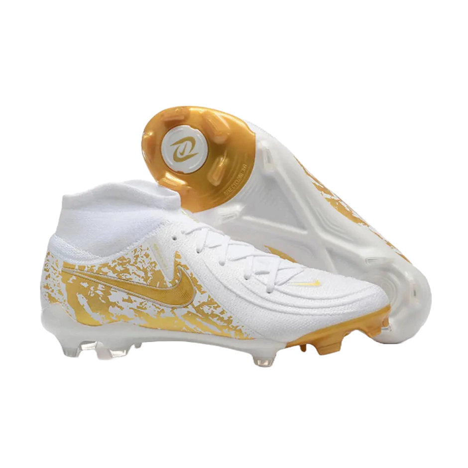 Los botines de fútbol Nike Phantom Luna Elite NU FG para terreno firme, presentados en una elegante combinación de colores blanco y dorado, son una opción excepcional para los jugadores que buscan tanto rendimiento como estilo en el campo. Diseñados específicamente para ofrecer un ajuste ceñido y una gran sensibilidad al balón, estos botines incorporan tecnología de vanguardia que mejora la tracción y el control en superficies firmes. La parte superior está confeccionada con un material ligero y transpirable que se adapta a la forma del pie, proporcionando comodidad durante todo el partido. Además, el diseño de la suela está optimizado con tacos estratégicamente colocados que permiten una aceleración rápida y cambios de dirección precisos, lo que resulta crucial en situaciones de juego dinámicas. La estética en blanco y dorado no solo resalta la sofisticación del calzado, sino que también simboliza la excelencia y la ambición que Nike busca transmitir a través de sus productos. En conjunto, estos botines no solo son una herramienta de alto rendimiento, sino también una declaración de estilo en el mundo del fútbol.